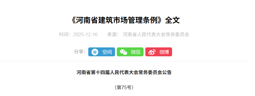 《河南省建筑市场管理条例》已经河南省第十四届人民代表大会常务委员会第二十一次会议于2025年12月4日审议通过,现予公布,自2026年3月1日起施行。